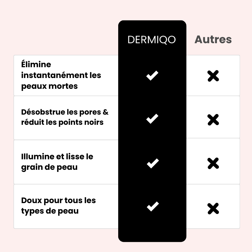 "L’action exfoliante ciblée de Dermiqo™ pénètre en douceur à la surface de la peau, élimine les impuretés et cellules mortes, stimule le renouvellement cellulaire et révèle un teint visiblement plus lisse, éclatant et uniforme."
