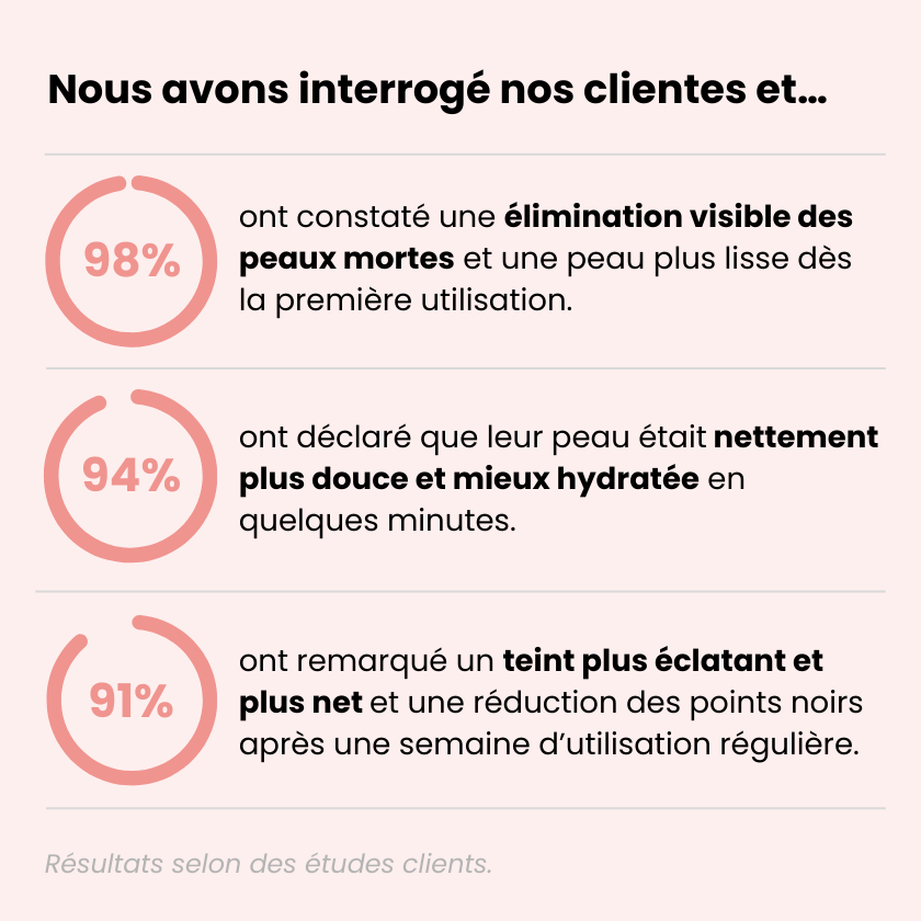 On peut littéralement sentir et voir les peaux mortes partir. Pas de picotement, pas de sécheresse, juste une peau propre et éclatante. 10/10 !"